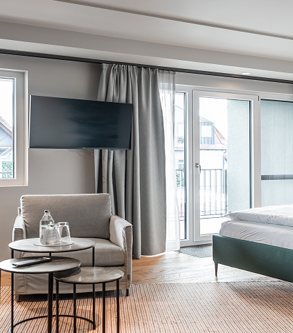 Auch optisch wird die Wertigkeit der eingesetzten Fensterprofile auf den ersten Blick deutlich: Die Außenseite ist durchgängig in der Dekorfolierung alux DB 703 ausgeführt – einem optisch stark an metallischen Eisenglimmer angelehnten, grauen Metallton, der seit Anfang 2026 aufgrund der großen Nachfrage zum VEKA Standardsortiment gehört. Innen sind die Fensterprofile in Weiß gehalten, um sich optimal in die jeweiligen Raumgestaltung einzupassen. Ähnlich durchdacht präsentiert sich die Gebäudetechnik der „Villa MainTraum“. Um individuelle Komfortwünsche der Gäste und maximale Nachhaltigkeit miteinander in Einklang zu bringen, werden alle Suiten und Zimmer über individuelle Wärmepumpen mit Energie versorgt, der dafür benötigte Antriebsstrom stammt aus dem hoteleigenen Blockheizkraftwerk.